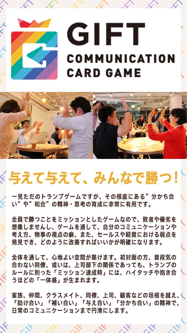 コミュニケーショントランプゲーム『GIFT』は、ただのツールに過ぎない。大事なのは、小さなテーブルを囲んだ4人で体感するあの小宇宙を、一人ひとりが実社会でどう工夫し、どう改良し、どう用いるかだ。